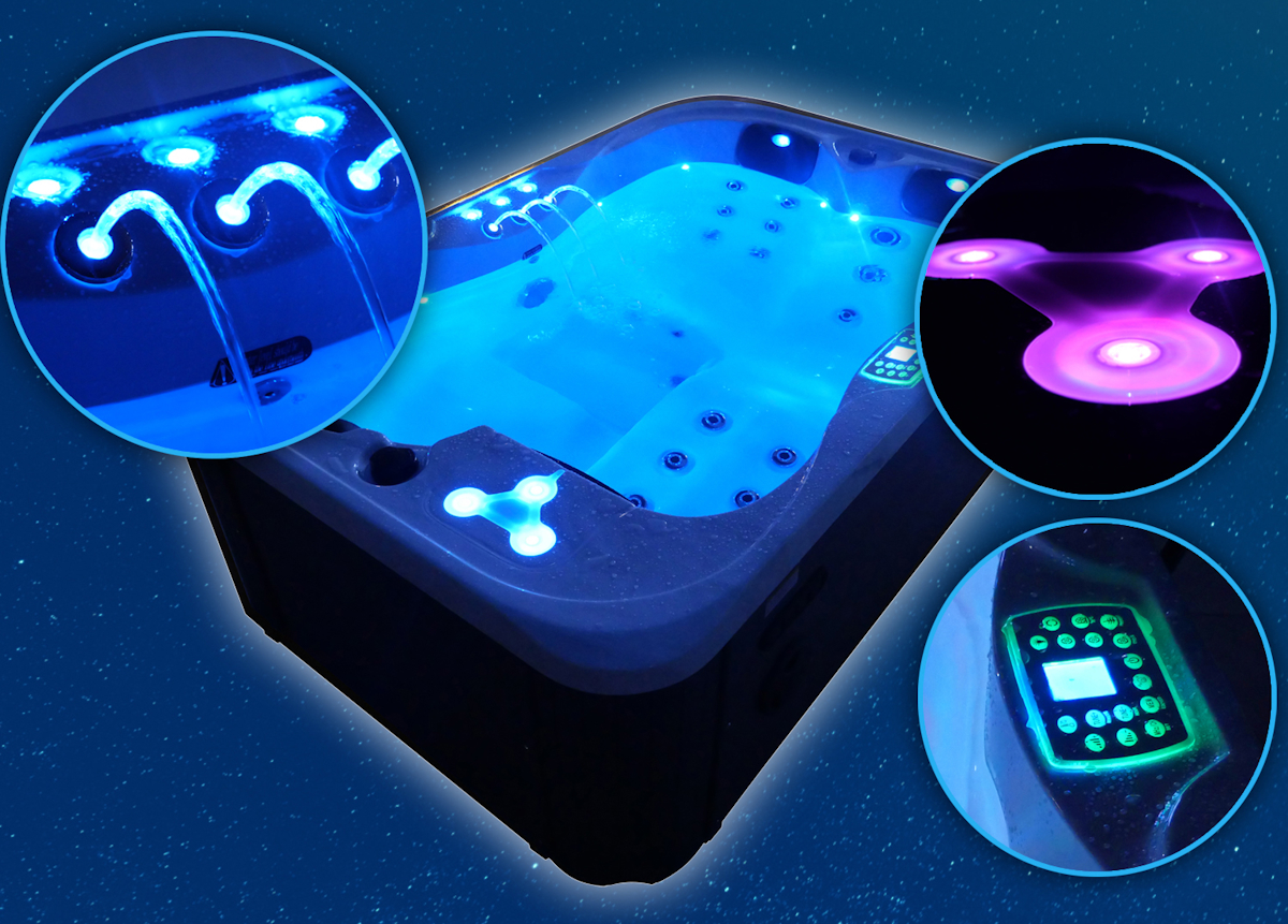 - the LED lightening with 35 light sources (also above the water surface and on the outer walls) creates an eye-catcher out of the pool, the different colours are changing automatically or you can choose one color
