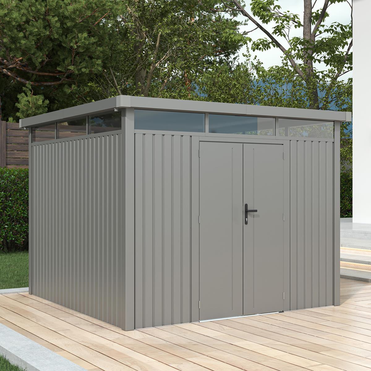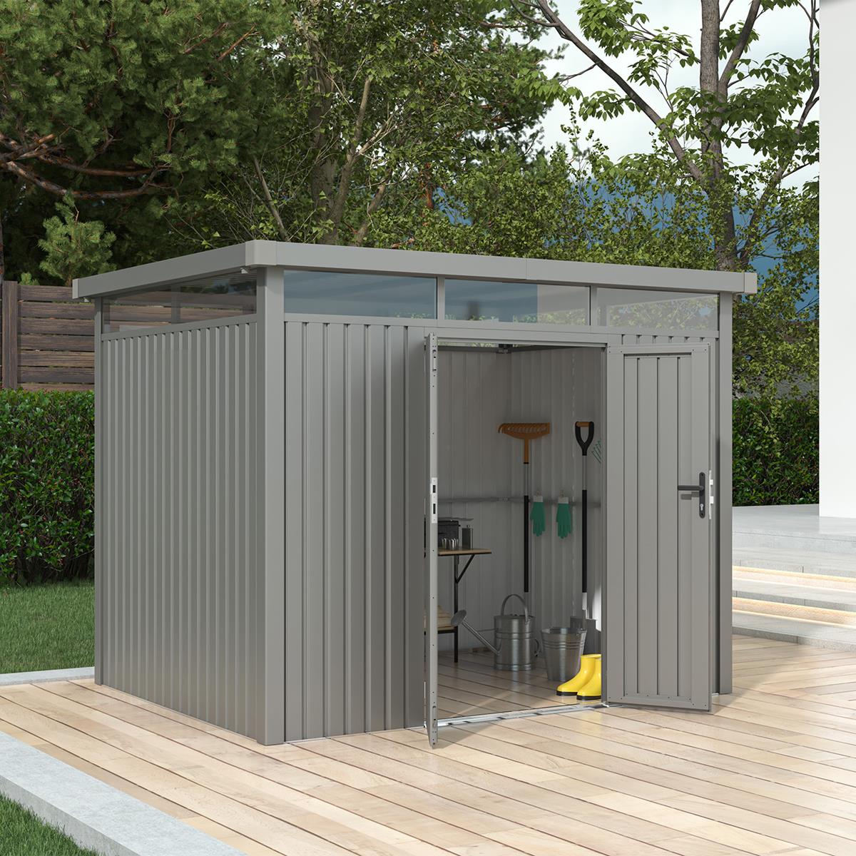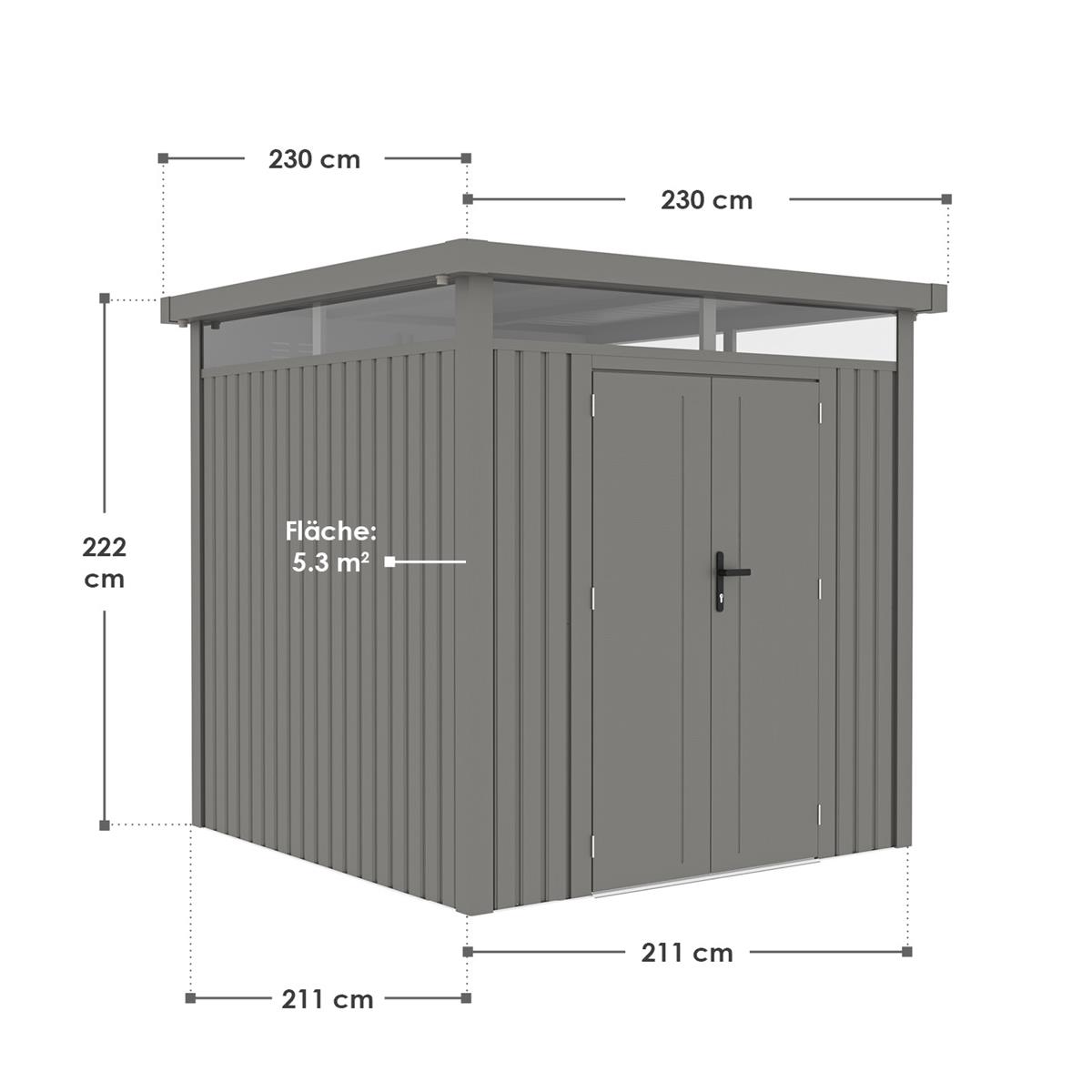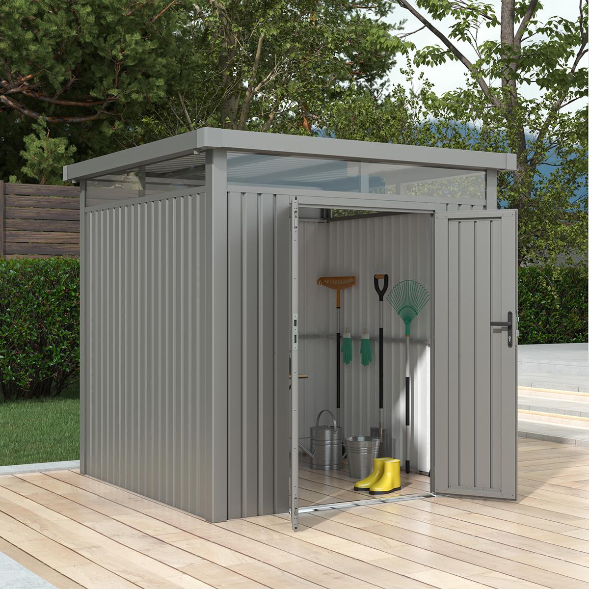 Modernes Metall Gartenhaus "Lyon" mit abschließbaren Türen und Tageslicht Fenster, in 3 Größen mit 5,3 m², 6,8 m² oder 8,6 m² Fläche - ideal für Gartengeräte, Fahrräder und Werkzeug