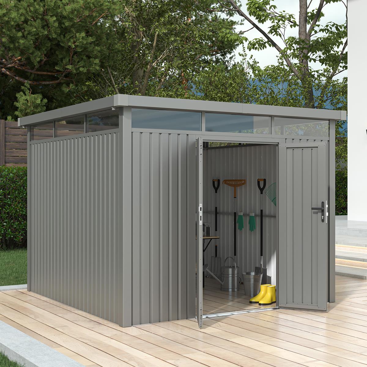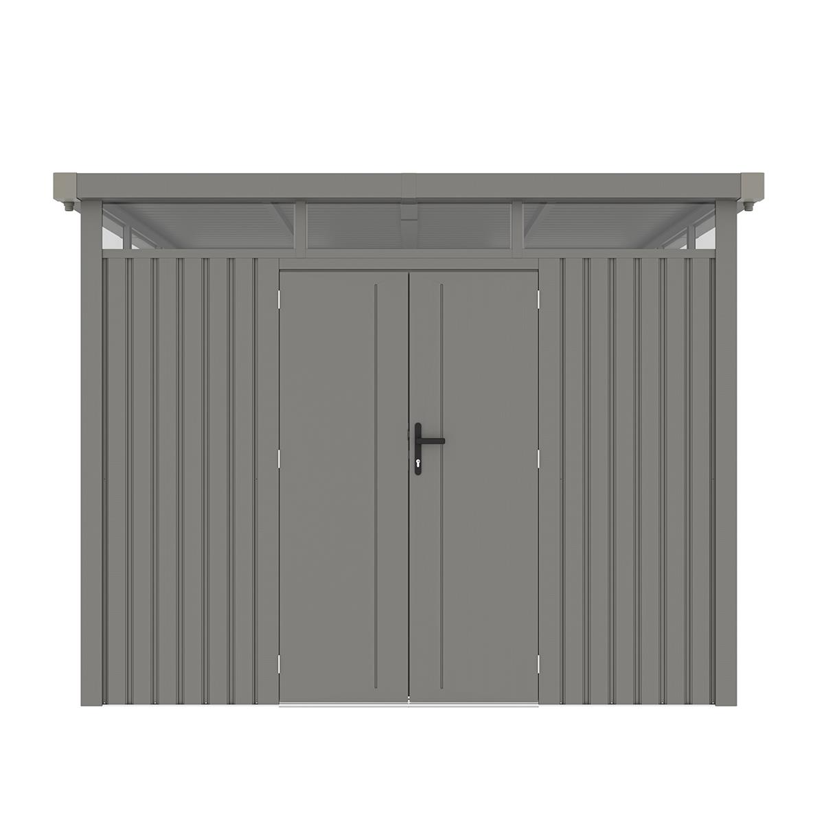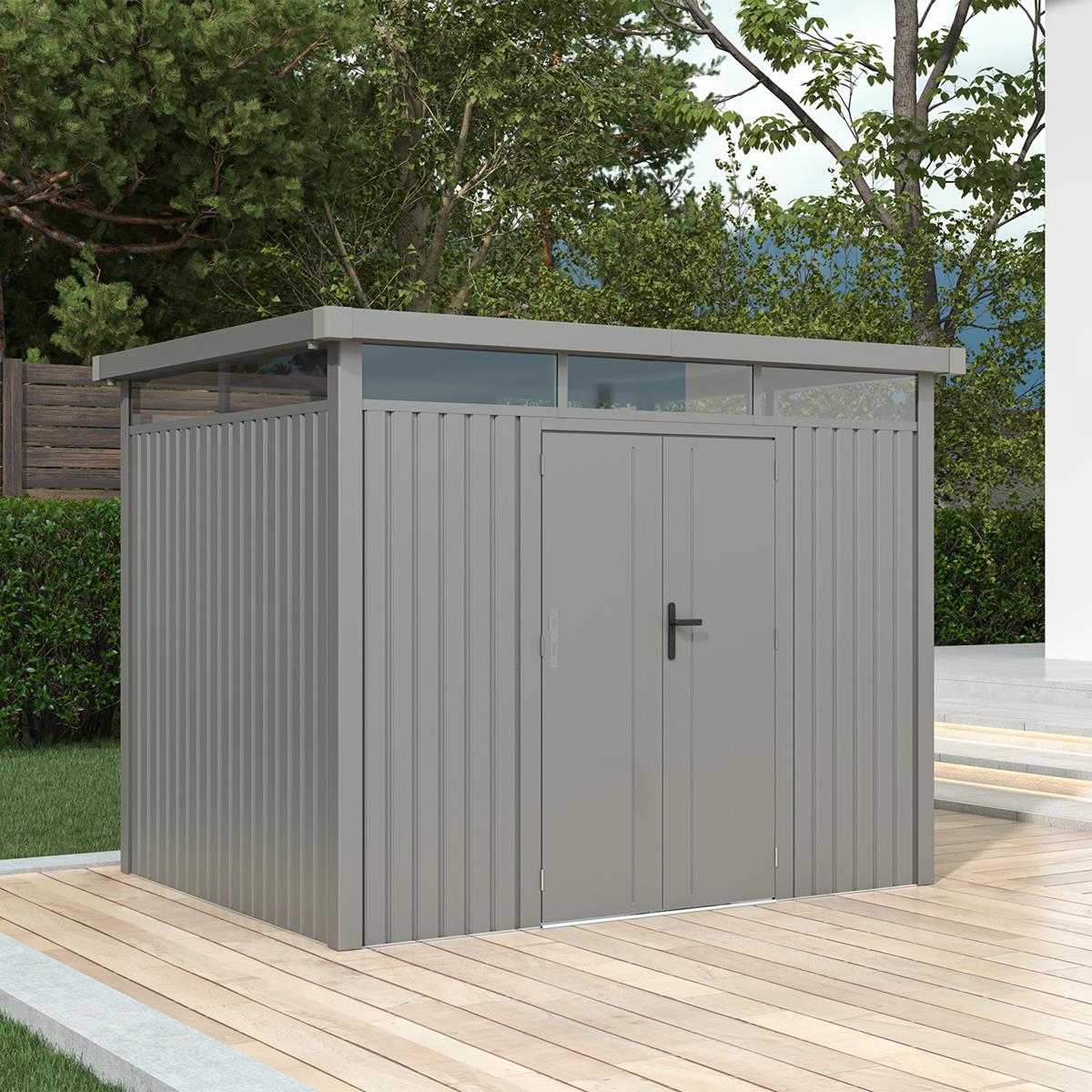 Modernes Metall Gartenhaus "Lyon" mit abschließbaren Türen und Tageslicht Fenster, in 3 Größen mit 5,3 m², 6,8 m² oder 8,6 m² Fläche - ideal für Gartengeräte, Fahrräder und Werkzeug